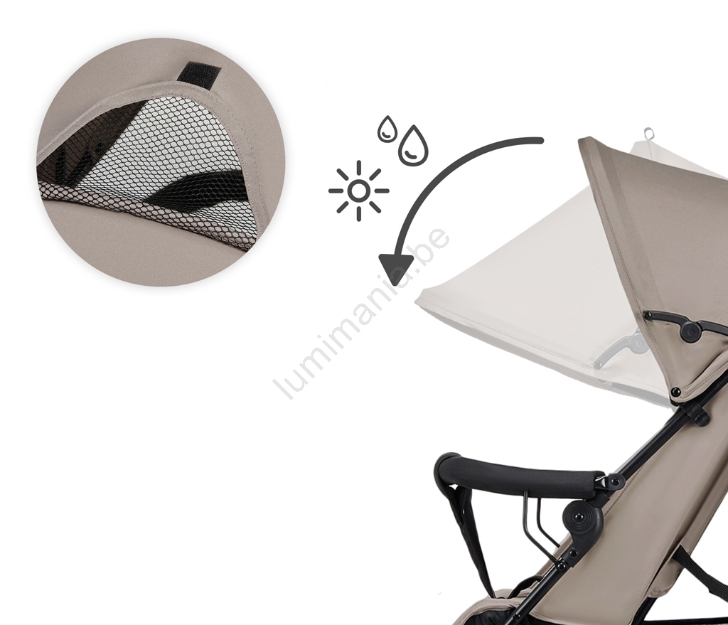 • De uitschuifbare kap biedt schaduw en bescherming en is uitgerust met een raampje voor gemakkelijk contact met het kind.