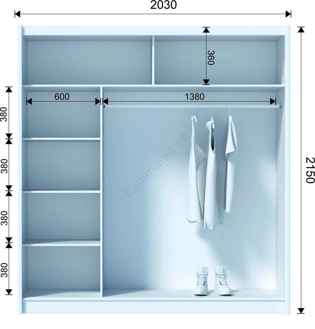 • De kast beschikt over 4 open planken, een kledingroede en 2 bovenplanken voor het opbergen van tassen en seizoensgebonden items.