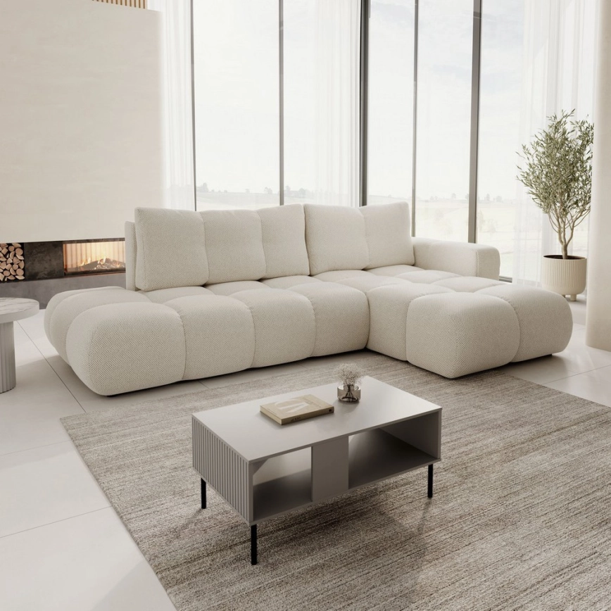 • L-vormige uitklapbare gestoffeerde hoekbank ALMADA met opbergruimte, rechts, beige