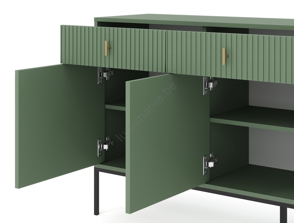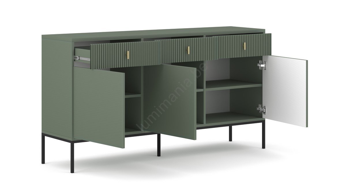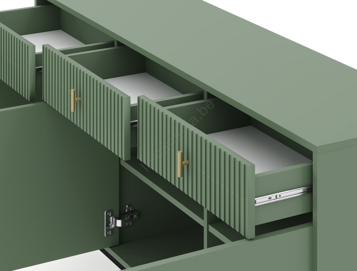 • Voorzien van drie onderdeuren met royale opbergruimte en drie lades met handgrepen en verticale ribbeling.