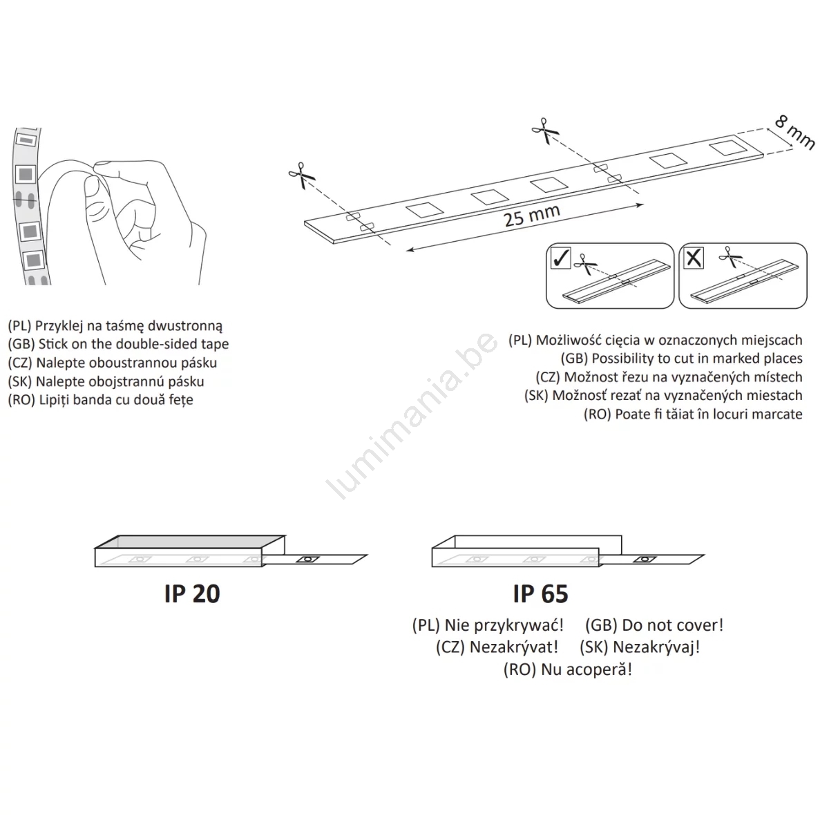 • Strip, voeding en controller met IP20-bescherming (geen waterbestendigheid) zijn bedoeld voor binnengebruik.