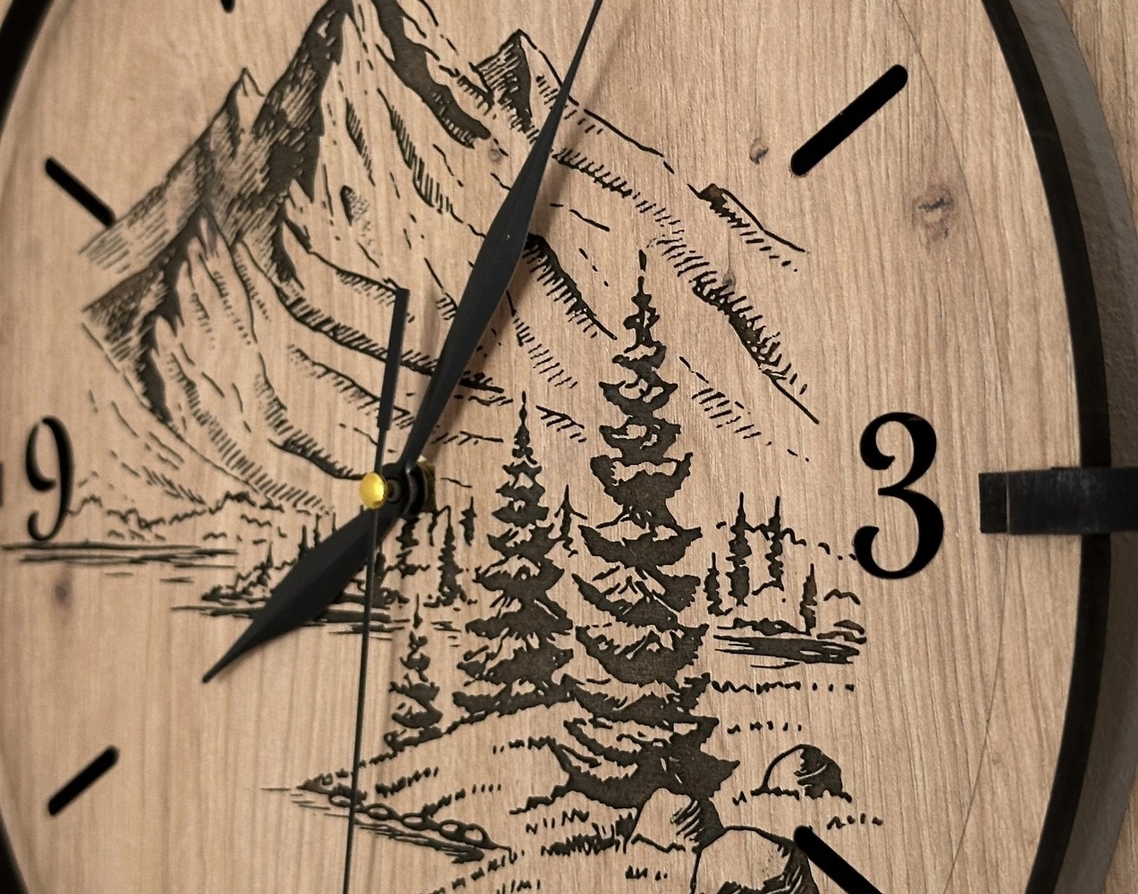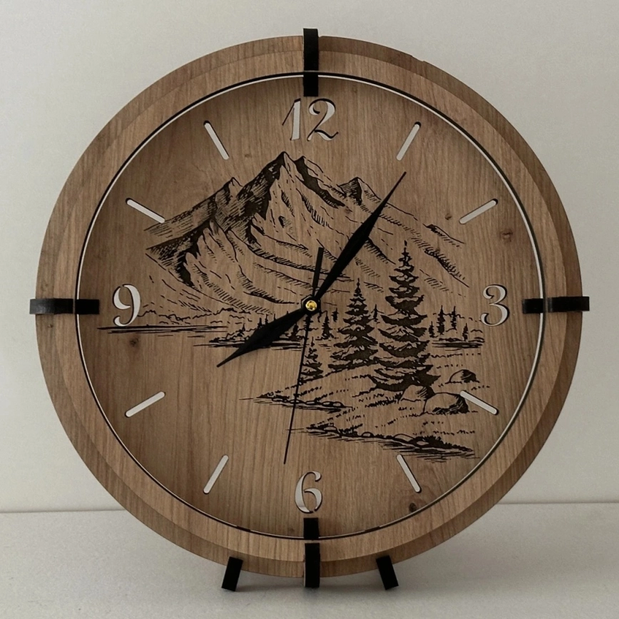 • Houten klok met een uniek gegraveerd motief.