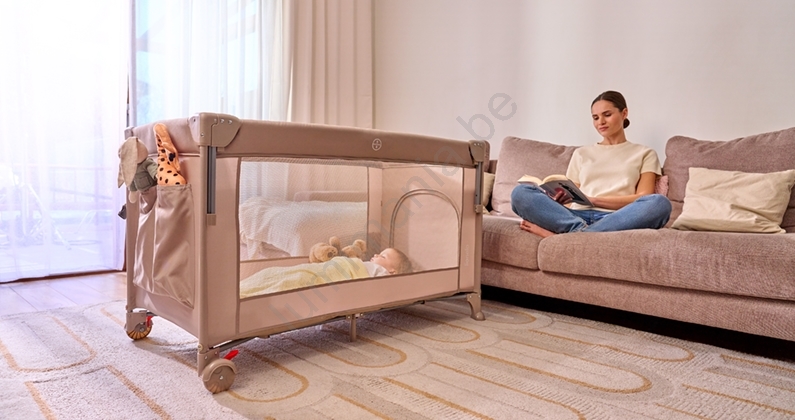 • Het bovenniveau van het bedje is geschikt voor baby's tot 9 kg of totdat ze zelfstandig kunnen zitten.