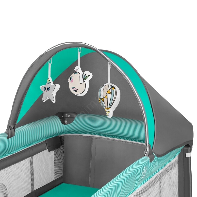• Inbegrepen: verschoontafel met zijvakken (voor luiers, babypoeder etc.), opbergmand voor accessoires met twee vakken, grote muskietennet, luifel en speelboog met pluche speeltjes.