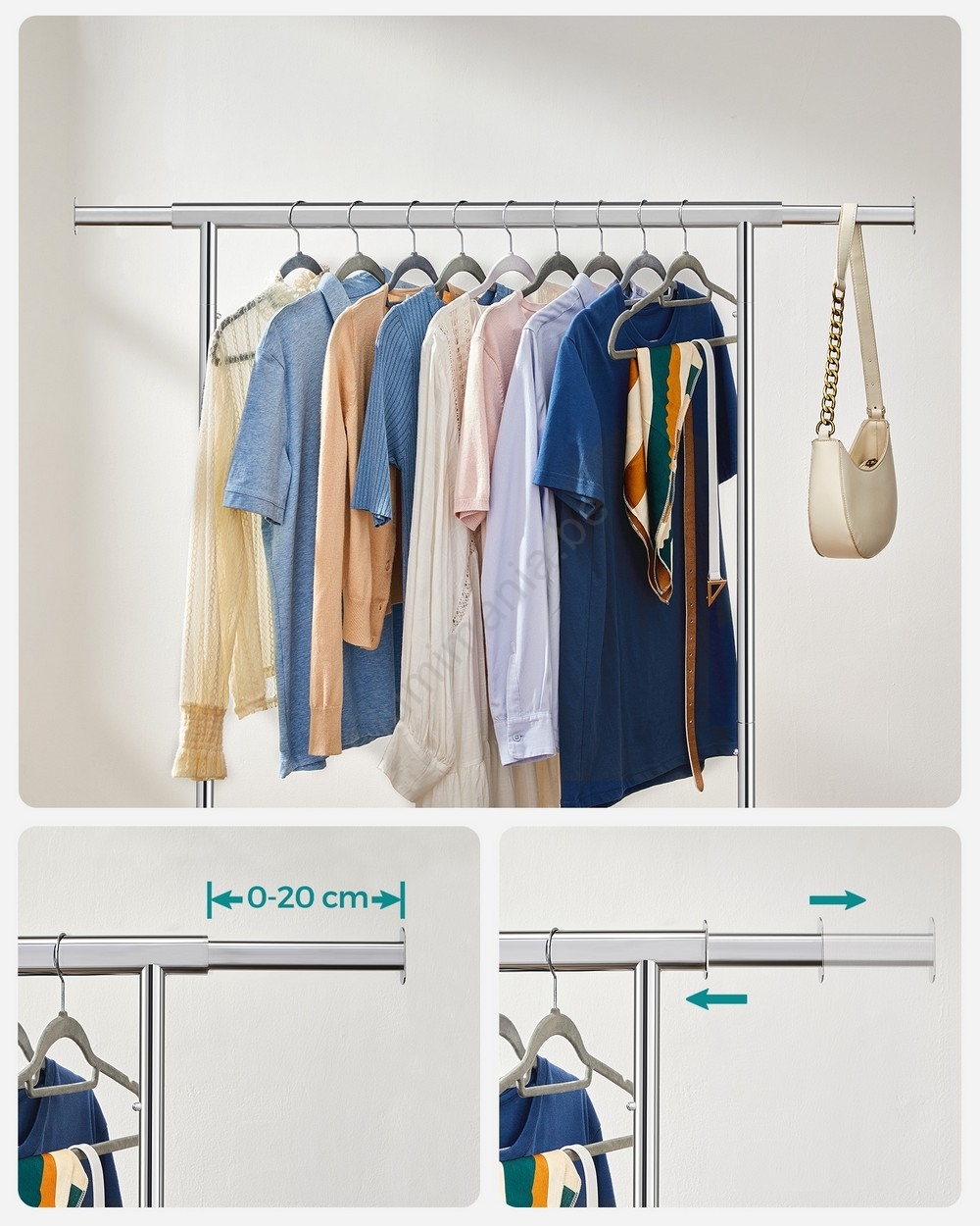 • De bovenste stang draagt tot 90 kg (bij gelijkmatige belasting) zonder te wiebelen of om te kantelen, de uitschuifbare stang biedt extra ruimte voor uw kleding, hoeden, tassen enz.