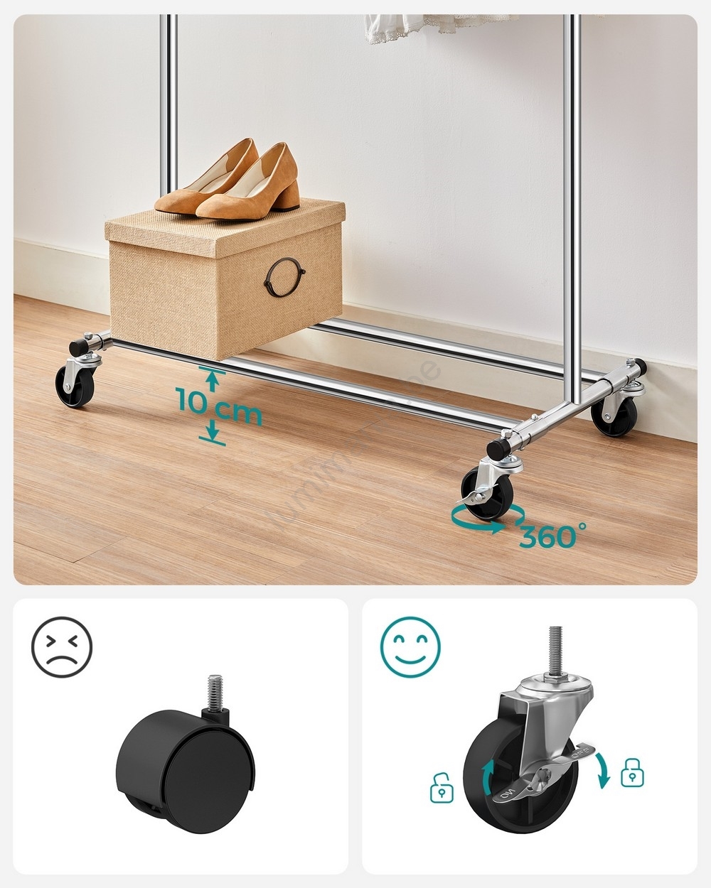 • 4 duurzame en 360 graden draaibare PP-wielen (2 remmen) maken verplaatsen eenvoudig of zorgen dat het rek stevig op zijn plaats blijft.