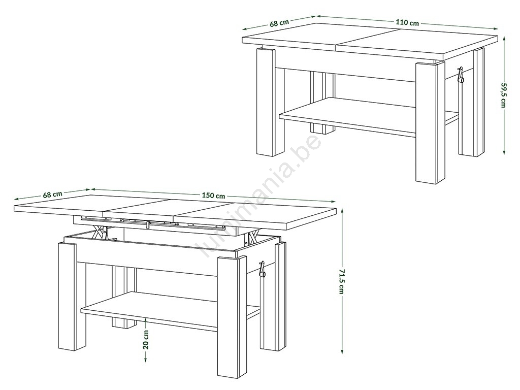 • Het blad kan worden opgeklapt tot een hoogte van 71,5 cm.