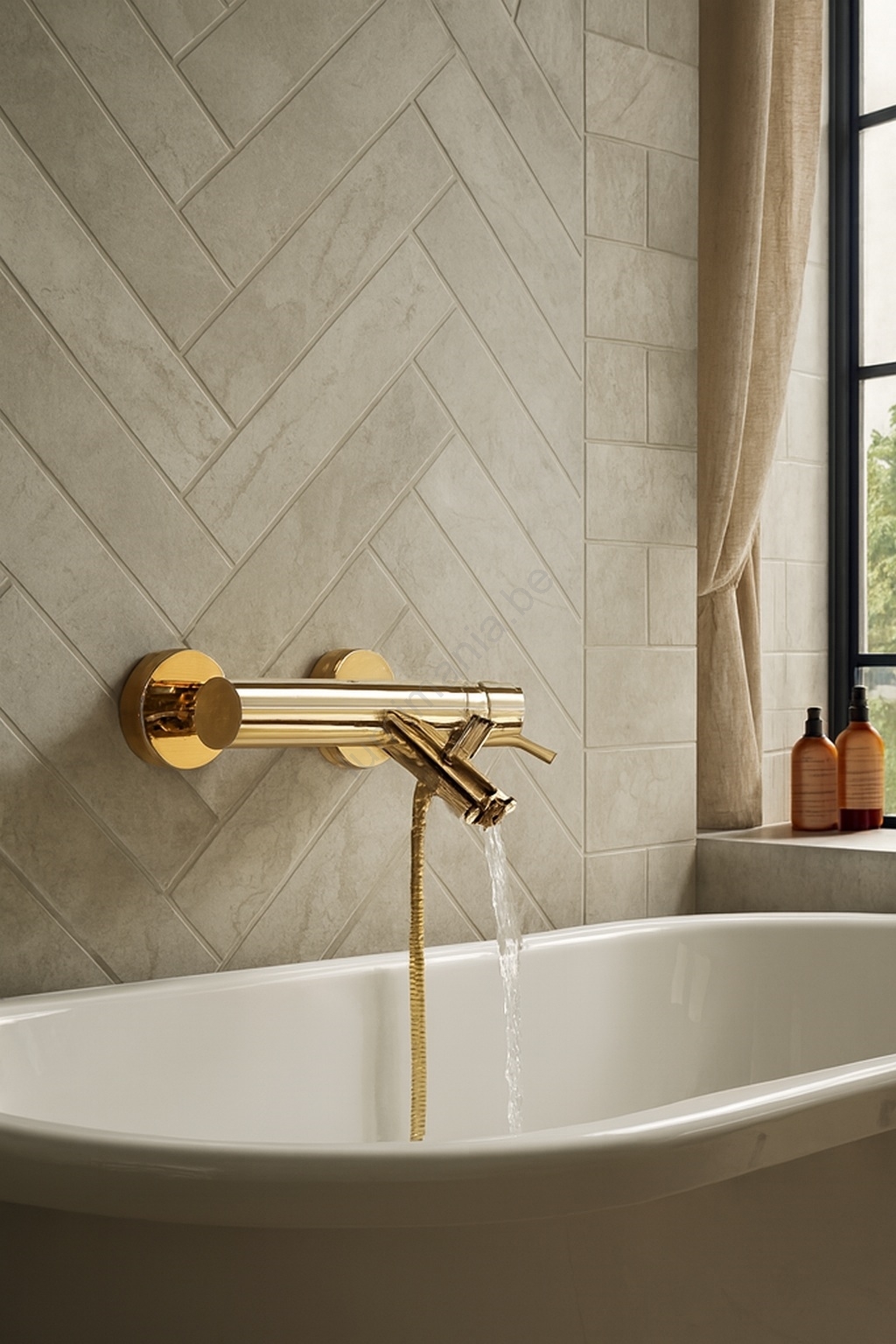 • Wandmontage badkraan met eengreepsbediening en een elegante goudkleurige afwerking.