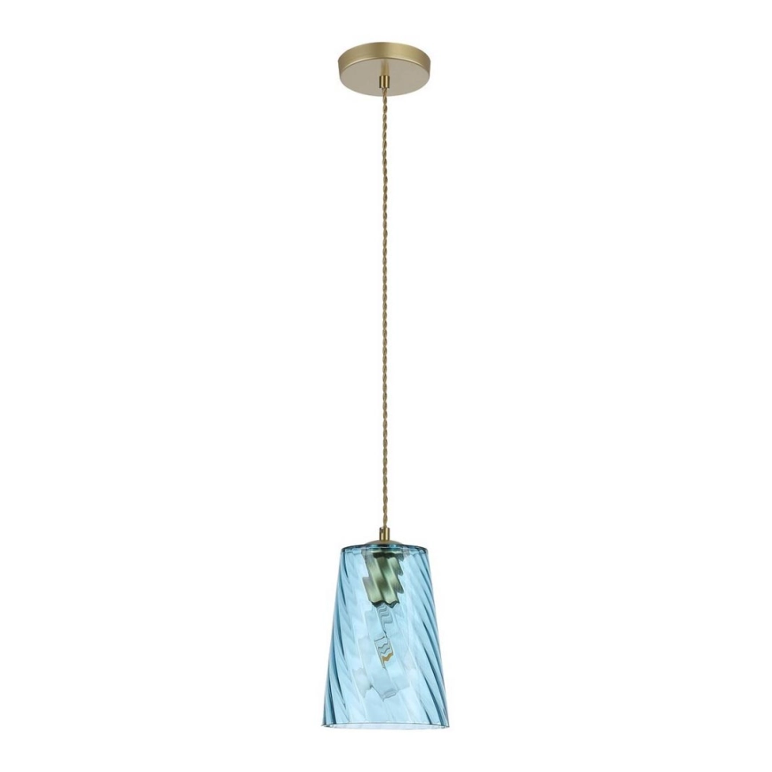 Zoals de naam al doet vermoeden, vult de moderne hanglamp Azurine uw woonkamer of slaapkamer met een azuurblauwe, kristalheldere glans. De lamp is vervaardigd uit metaal en glas, in een bijzonder elegante goud-blauwe kleurcombinatie; de lampenkap is verbonden met een gouden, ronde sierplaat via een stoffen kabel. Het golvende oppervlak van de langwerpige glazen kap in klokvorm roept de zee op. De Azurine lamp is geschikt voor één lamp van maximaal 40W, met een E27-fitting. Wilt u de intieme sfeer in huis versterken, kies dan voor een warmwitte lichtbron bij deze lamp. De afmetingen van de Azurine hanglamp zijn als volgt: de diameter van de kap is 150 mm, de afstand tot het plafond is 1750 mm, en de montageplaat heeft een diameter van 120 mm. Dit model wordt geleverd zonder lichtbron.