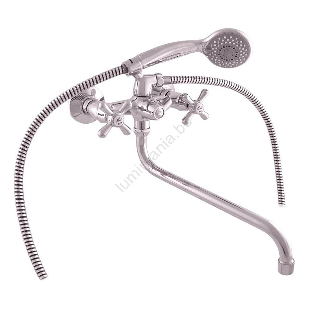 • Badset met wandkraan met keramische omsteller, ronde uitloop, douche en douchehouder.