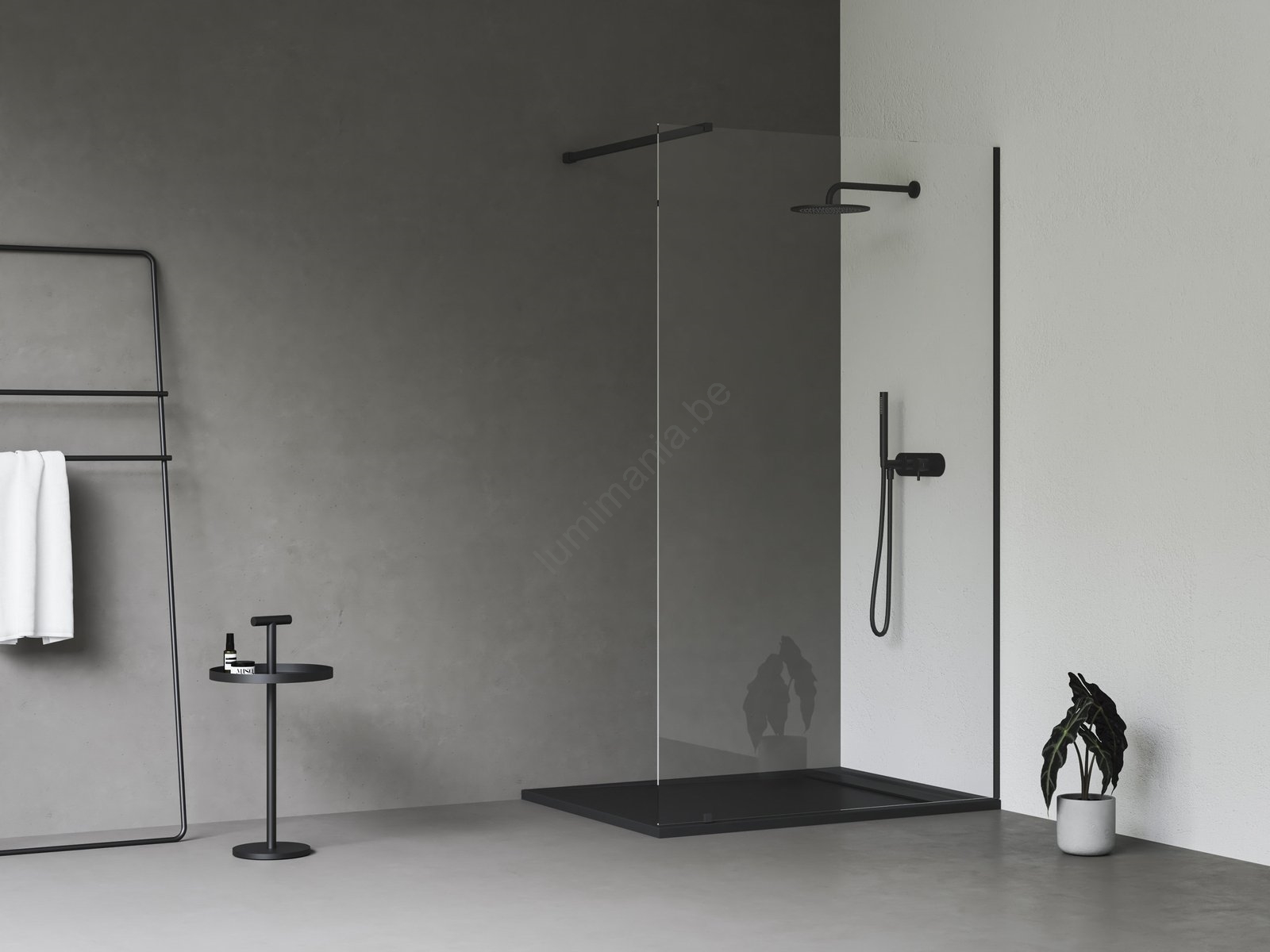 • De set bevat de vaste glazen wand, het instelprofiel, de steunbeugel en de metalen stang in zwarte uitvoering.
