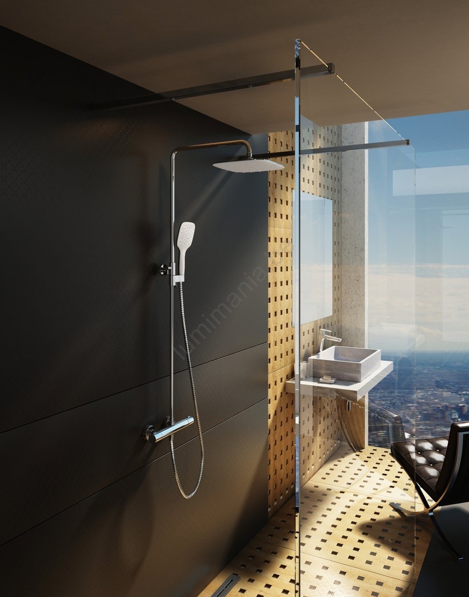 • Douchekolom Termo is een verstelbare set met een thermostaatkraan in glanzend chroom met een witte hoofddouche.