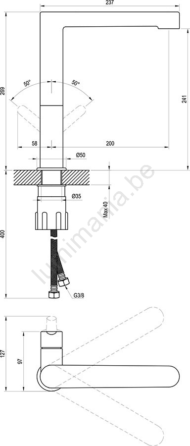 • De kraan wordt geleverd zonder waste en bevat flexibele aansluitslangen van 450 mm lengte met een diameter DN8 b.