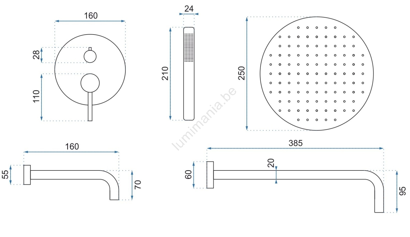 • Inhoud verpakking: inbouwbox, complete kraan, douchearm, handdouche en hoofddouche, handdouchehouder, uitloop, 150 cm slang.