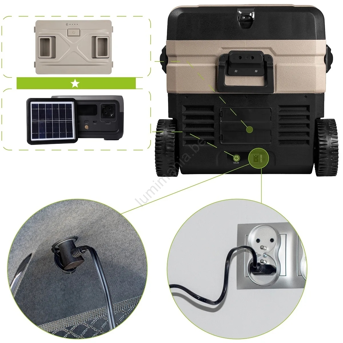 • Drie niveaus van batterijbescherming: LAAG, MIDDELS of HOOG (wanneer de spanning onder een veilig niveau daalt, schakelt de koelkast automatisch uit om de batterij te beschermen tegen ontlading).