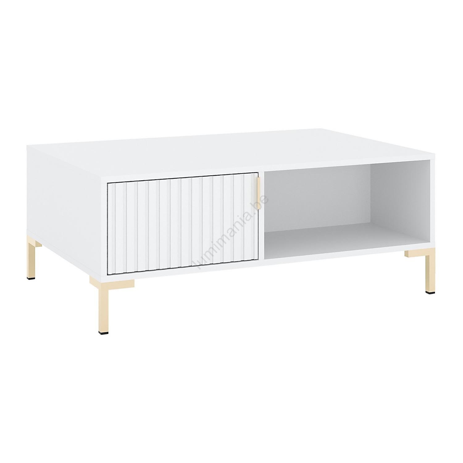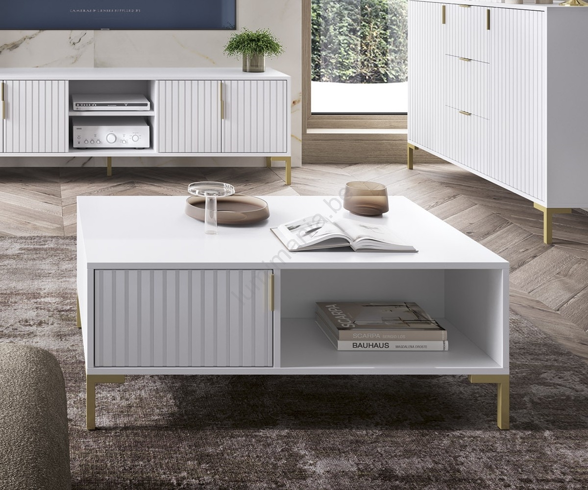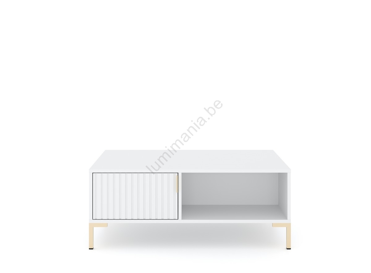 • Hij heeft twee open planken en twee laden, afgewerkt met een verticale ribbelstructuur voor een verfijnd visueel effect.