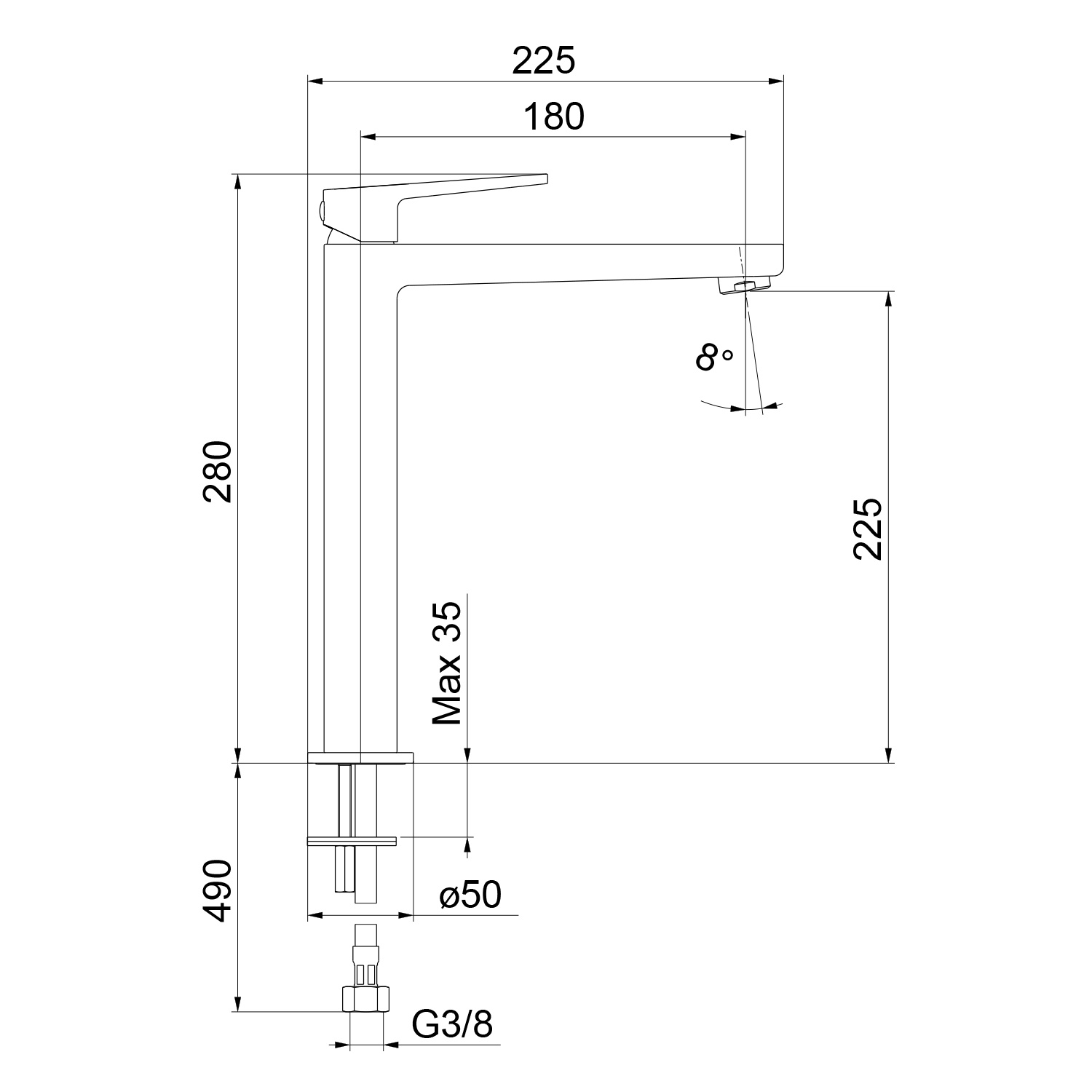 • De uitloophoogte is 225 mm en de uitloopdiepte is 225 mm.