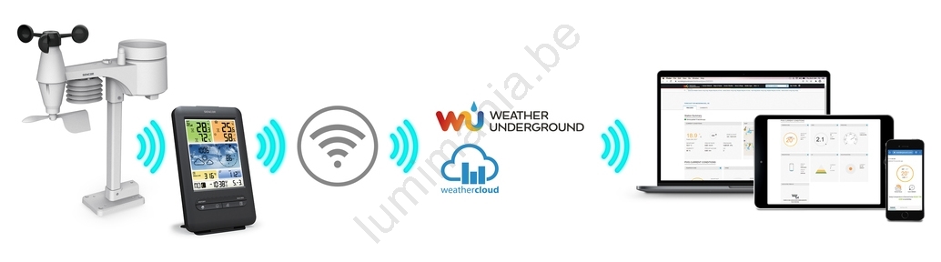 • Ondersteunt slimme apparaten, online toegang tot geschiedenis, gegevens en wereldwijde openbare meteorologische platforms "Weather Underground" en "Weathercloud".