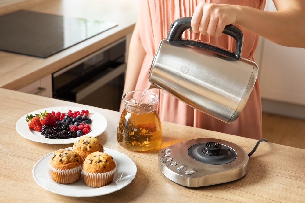 • De waterkoker biedt de mogelijkheid van elektronische thermoregulering en handhaving van de gekozen temperatuur.