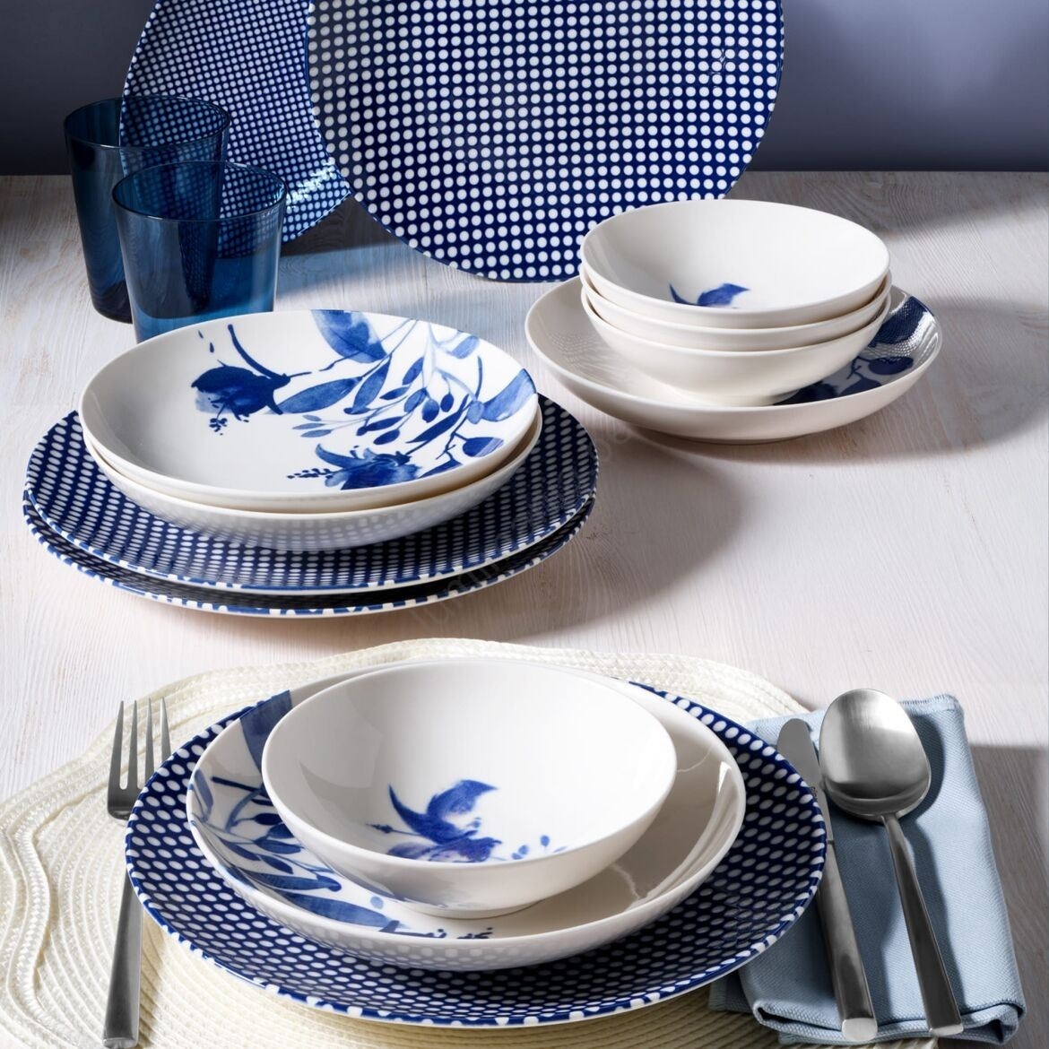 Serviesset 14-delig, wit/blauw, porselein
