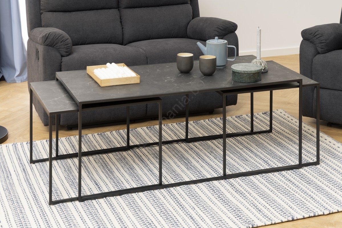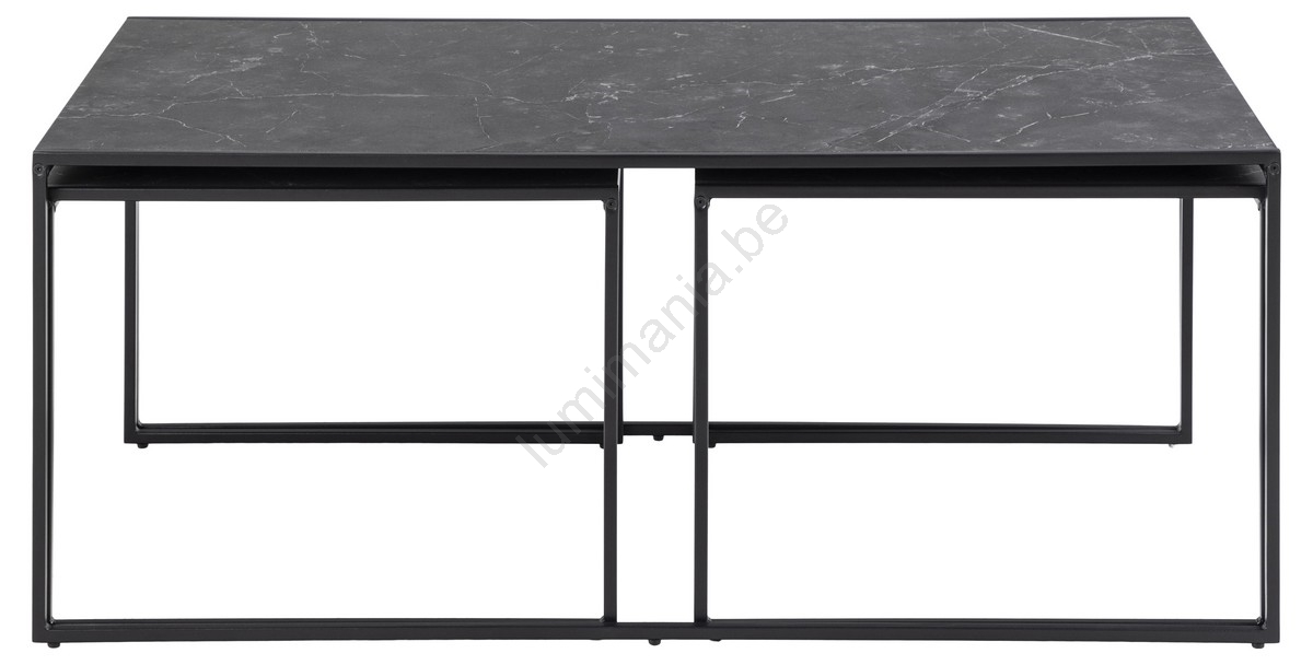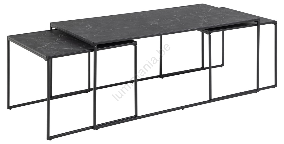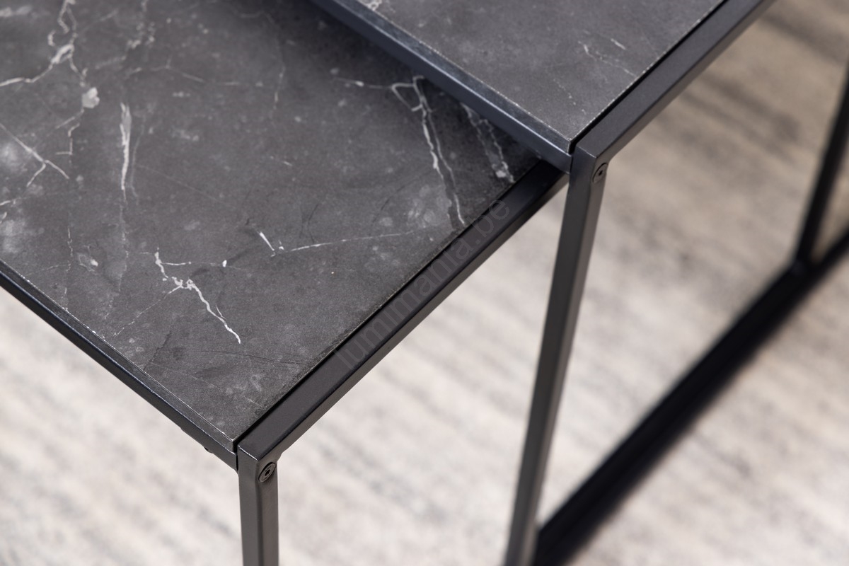 • Dankzij de strakke lijnen, de marmeren uitstraling en de zwarte poedercoating past deze salontafelset vrijwel in elke woonkamer.