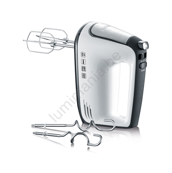 • Handmixer in een modern wit-zwart ontwerp met roestvrijstalen accenten is een krachtige hulp voor efficiënt kneden en kloppen van ingrediënten.