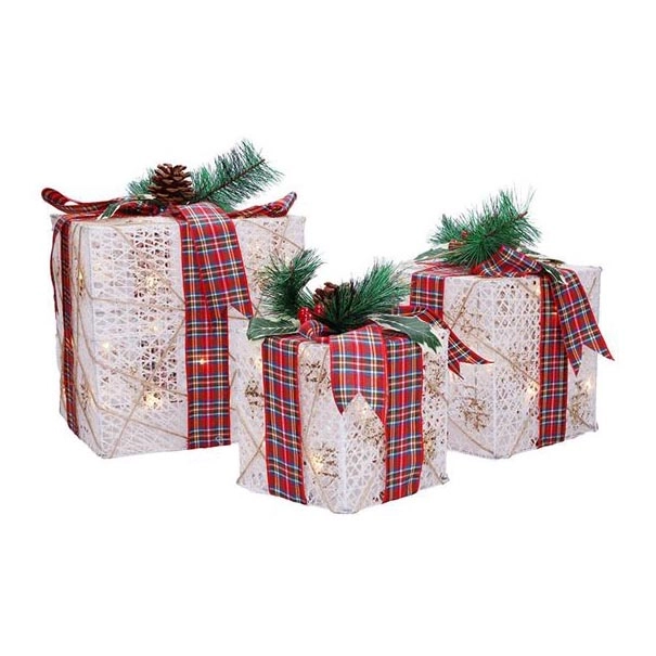 • Set van drie decoratieve kerstcadeaus met LED-verlichting.