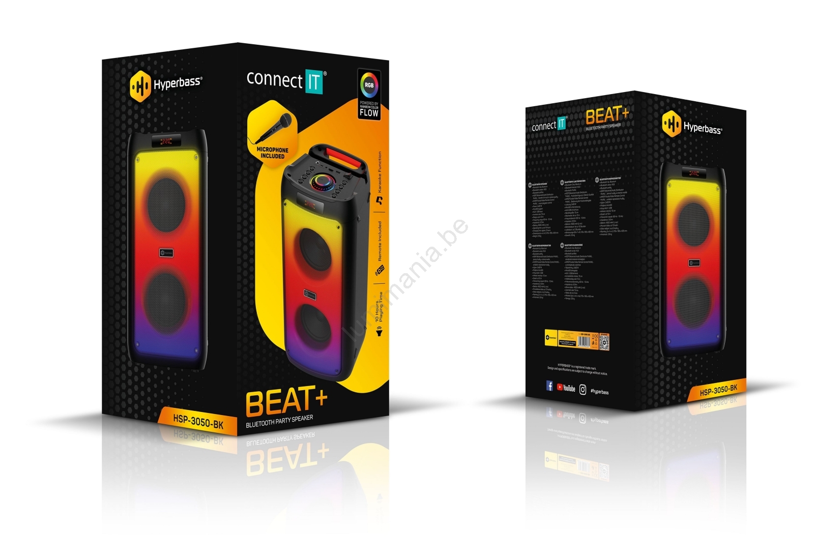 • Inhoud van de verpakking: speaker, microfoon, afstandsbediening, 2x AAA-batterijen, USB-C voedingskabel.