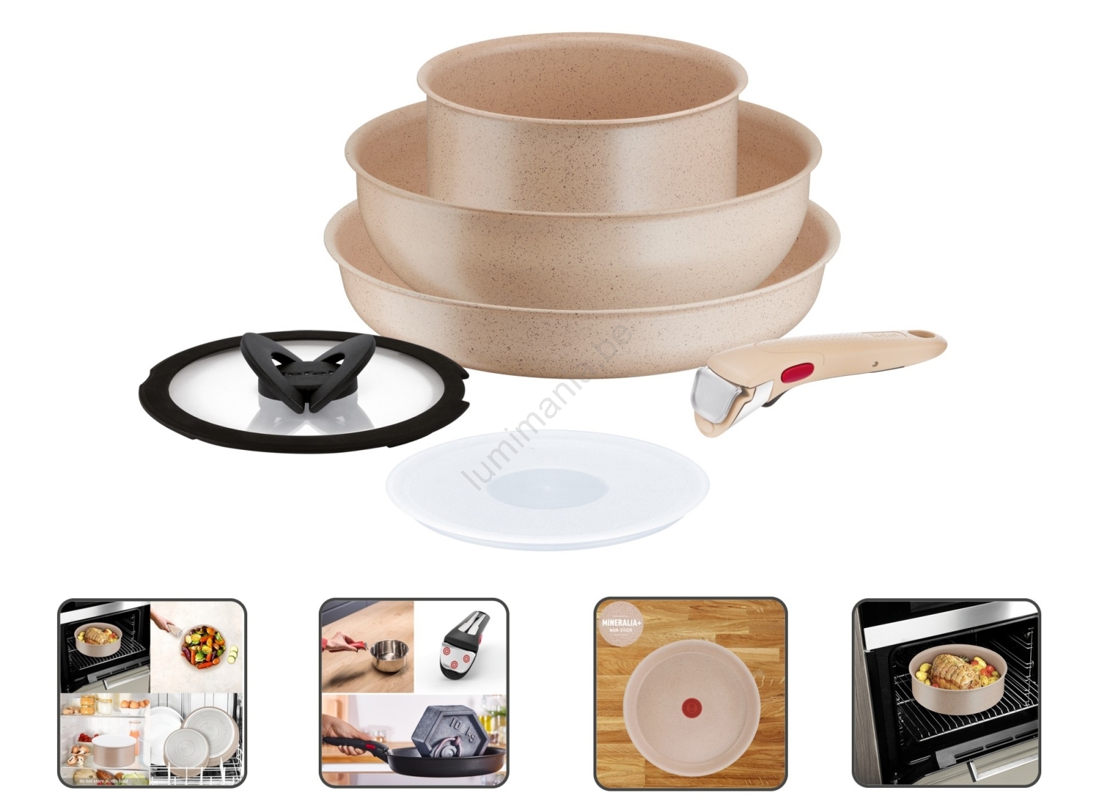 • De Tefal Ingenio Delight-set bevat een koekenpan (28 cm), een wokpan (26 cm), een steelpan (18 cm), een glazen deksel (18 cm), een hermetisch deksel (18 cm) en een afneembare handgreep.