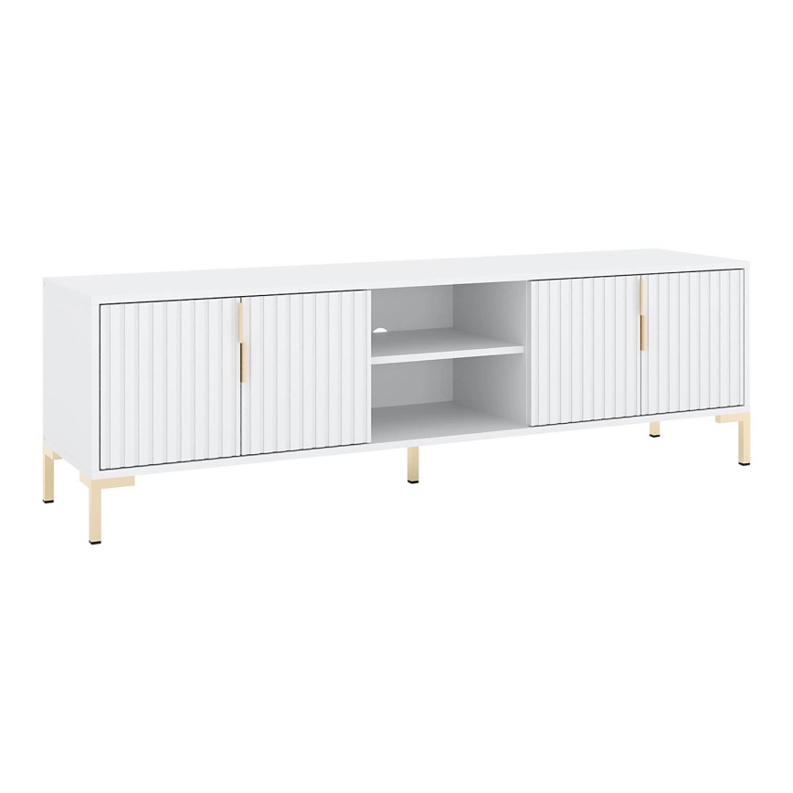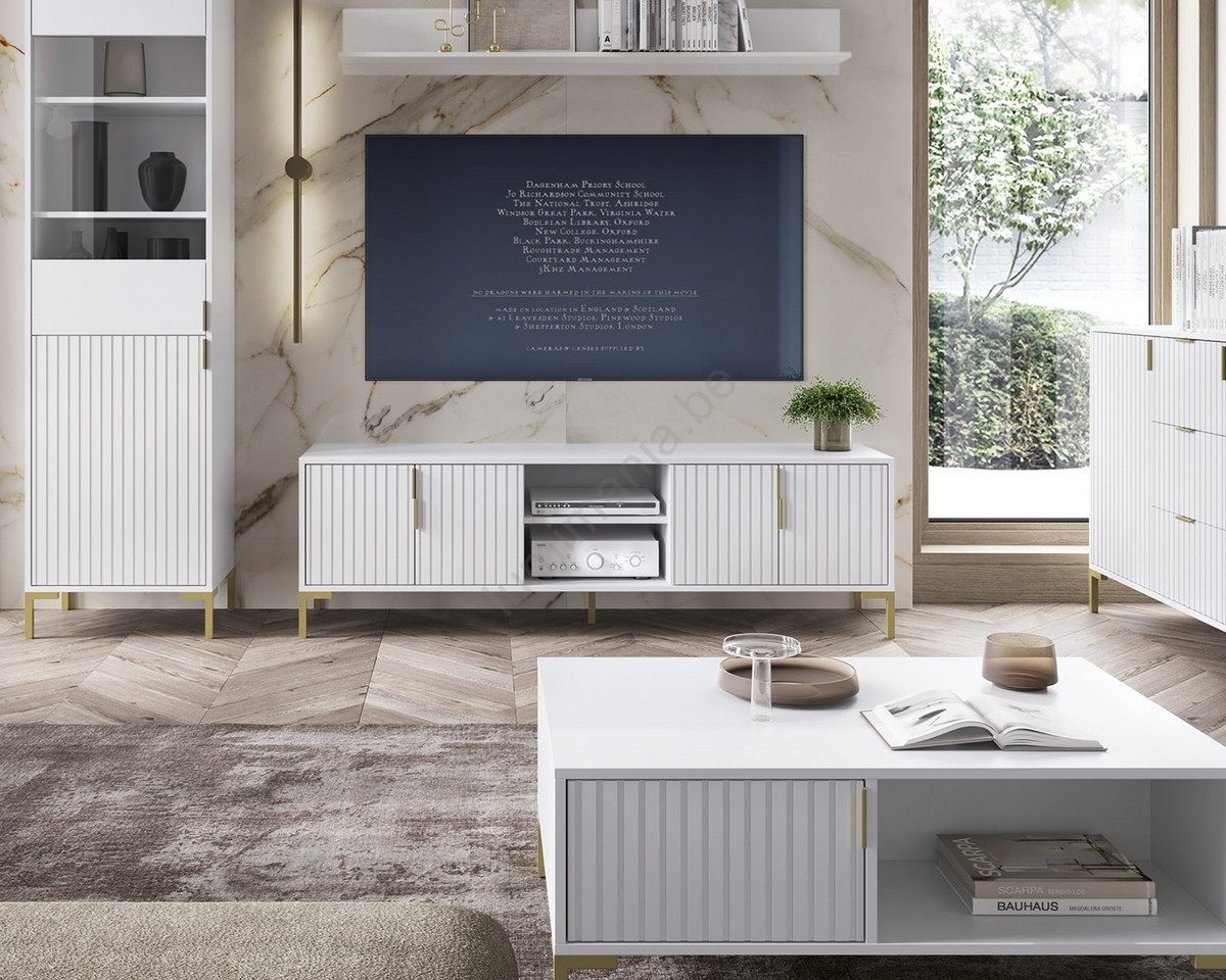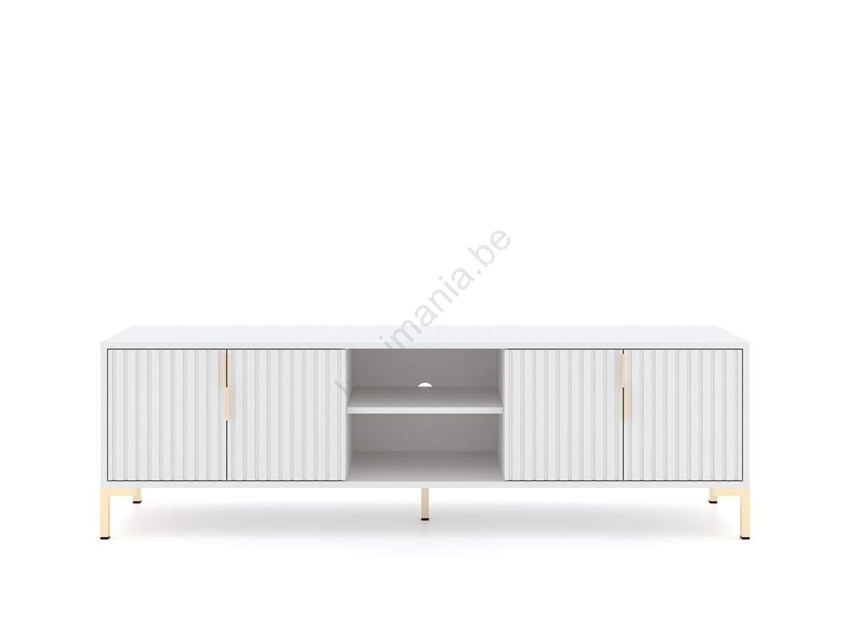 • Het heeft twee gesloten zijvakken, elk met twee deurtjes met symmetrische handgrepen en geribbelde fronten, en twee open planken met een kabeldoorvoer in het midden.