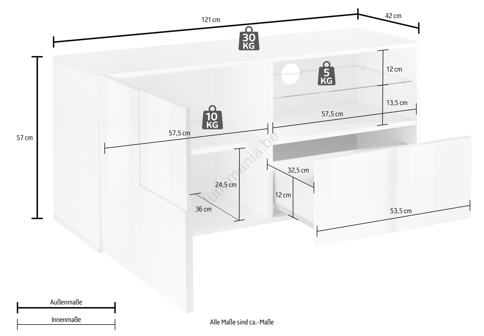 • Door de lange, rechthoekige vorm is het ideaal voor plaatsing onder een aan de muur gemonteerde televisie of als moderne opbergoplossing in de woonkamer.