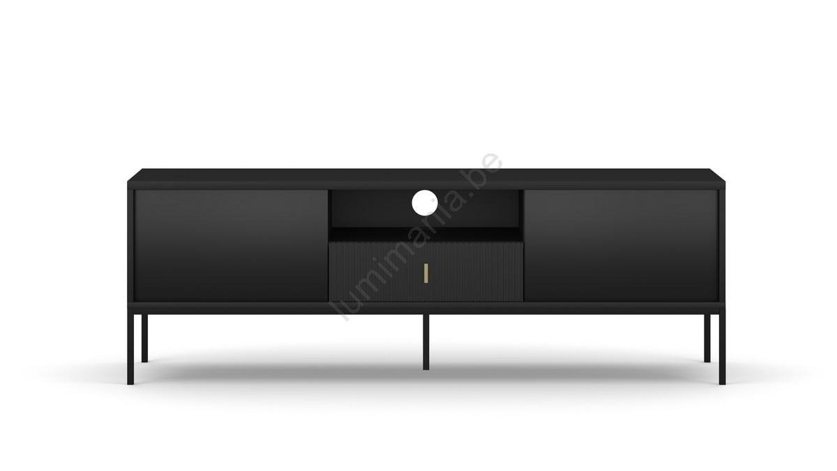 • Het heeft twee gesloten zijvakken, een open plank met een kabeldoorvoer in het midden en een lade onder de plank met geribbelde afwerking.