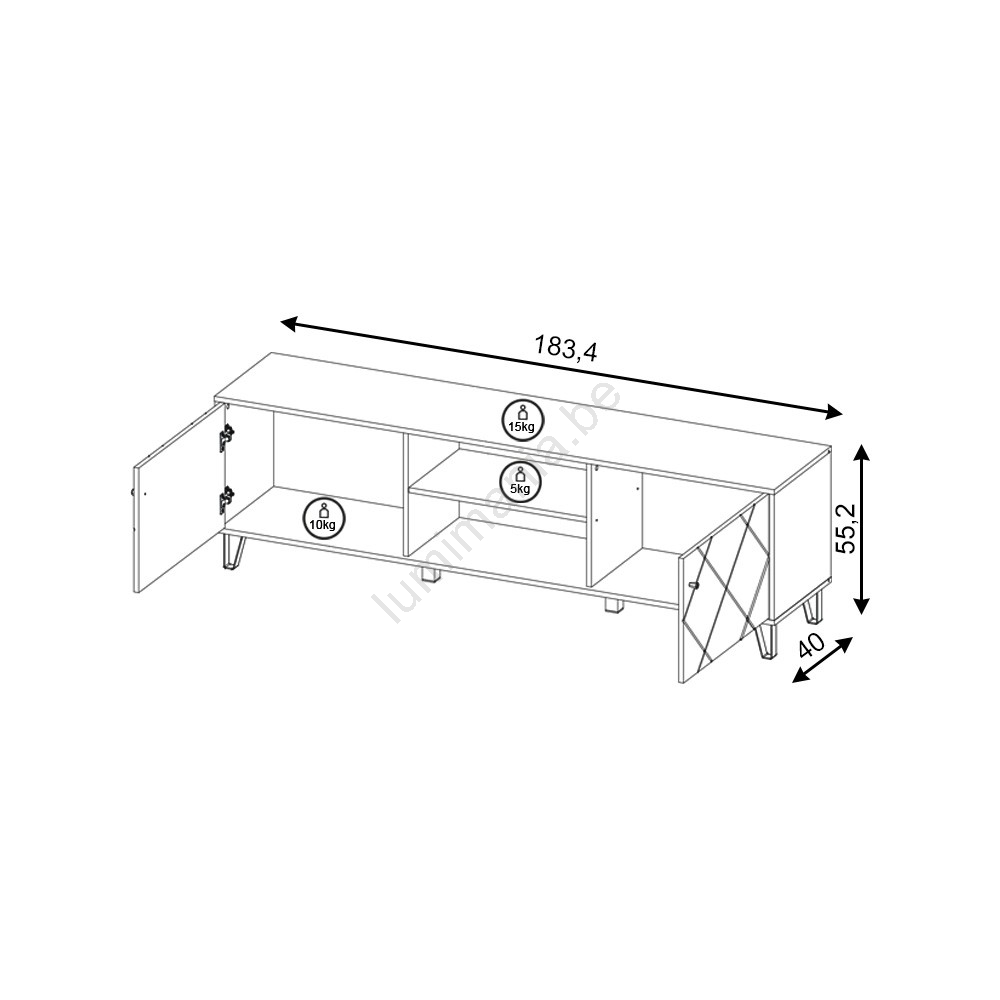 • Het heeft twee gesloten zijvakken, elk met een deurtje met een decoratieve diagonale afwerking, en twee open planken met een kabeldoorvoer in het midden.