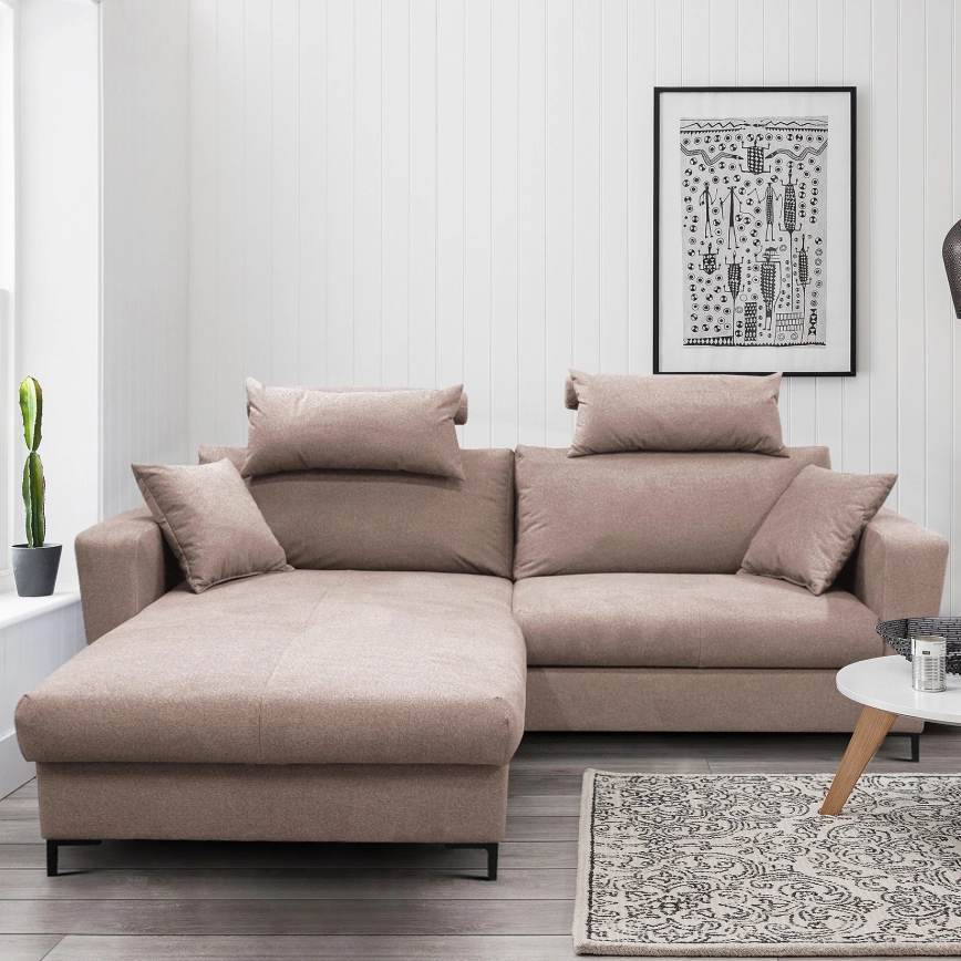 L-vormige hoekbank HORTA met slaapfunctie en opbergruimte, links, roze