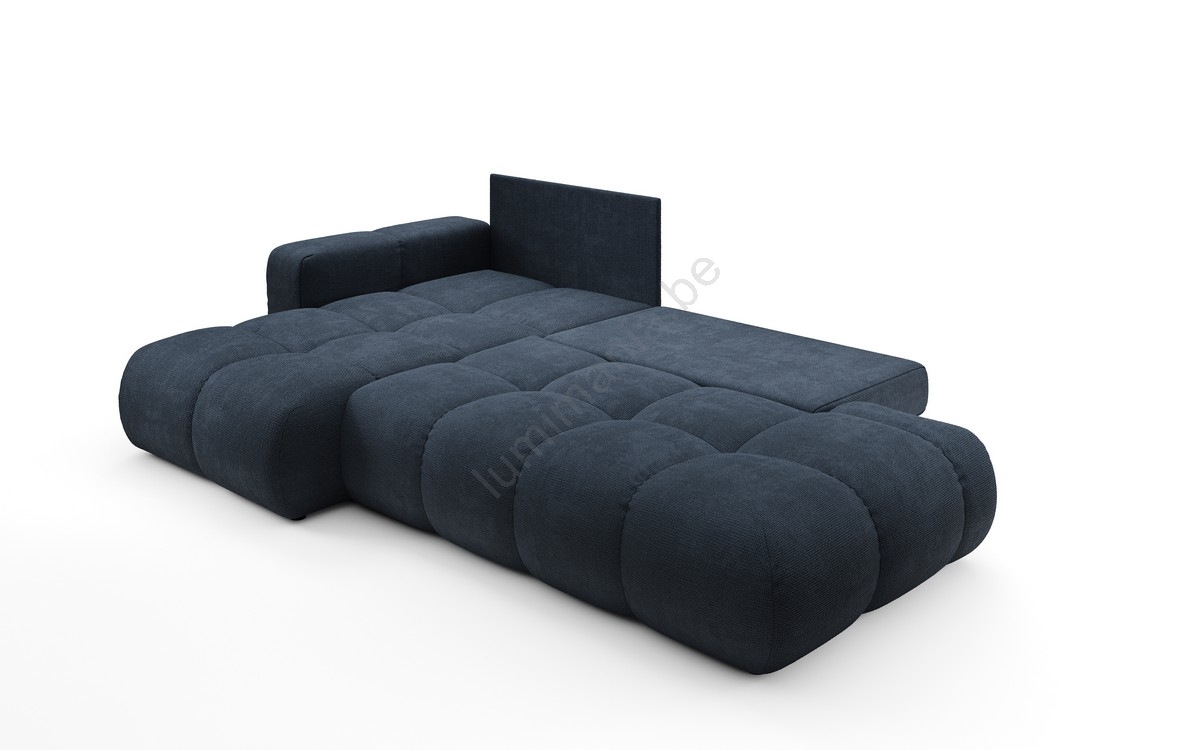 • ALMADA uitklapbare gestoffeerde hoekbank in L‑vorm, linkerhoek, met opbergruimte, blauw