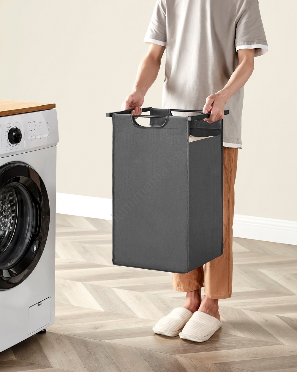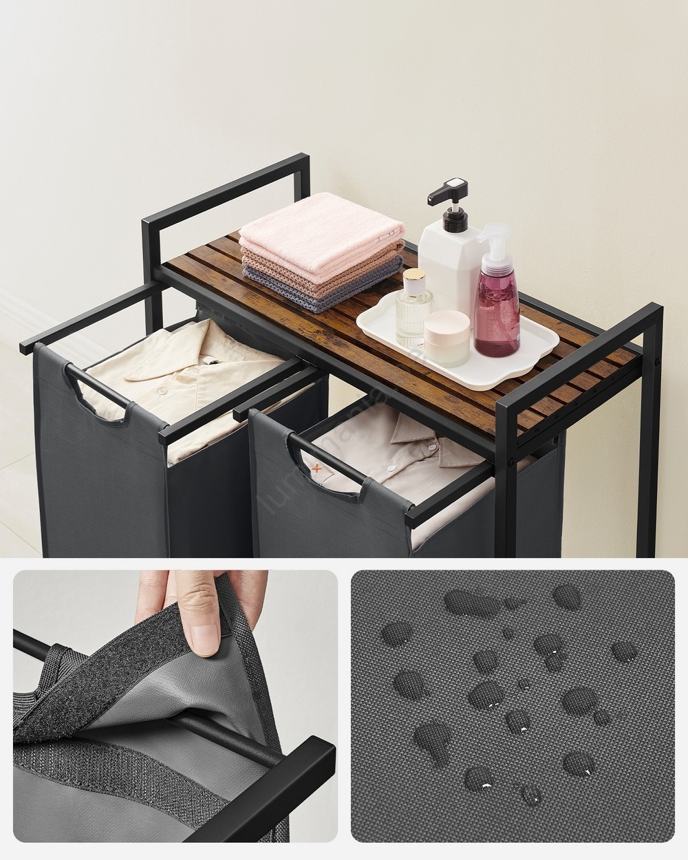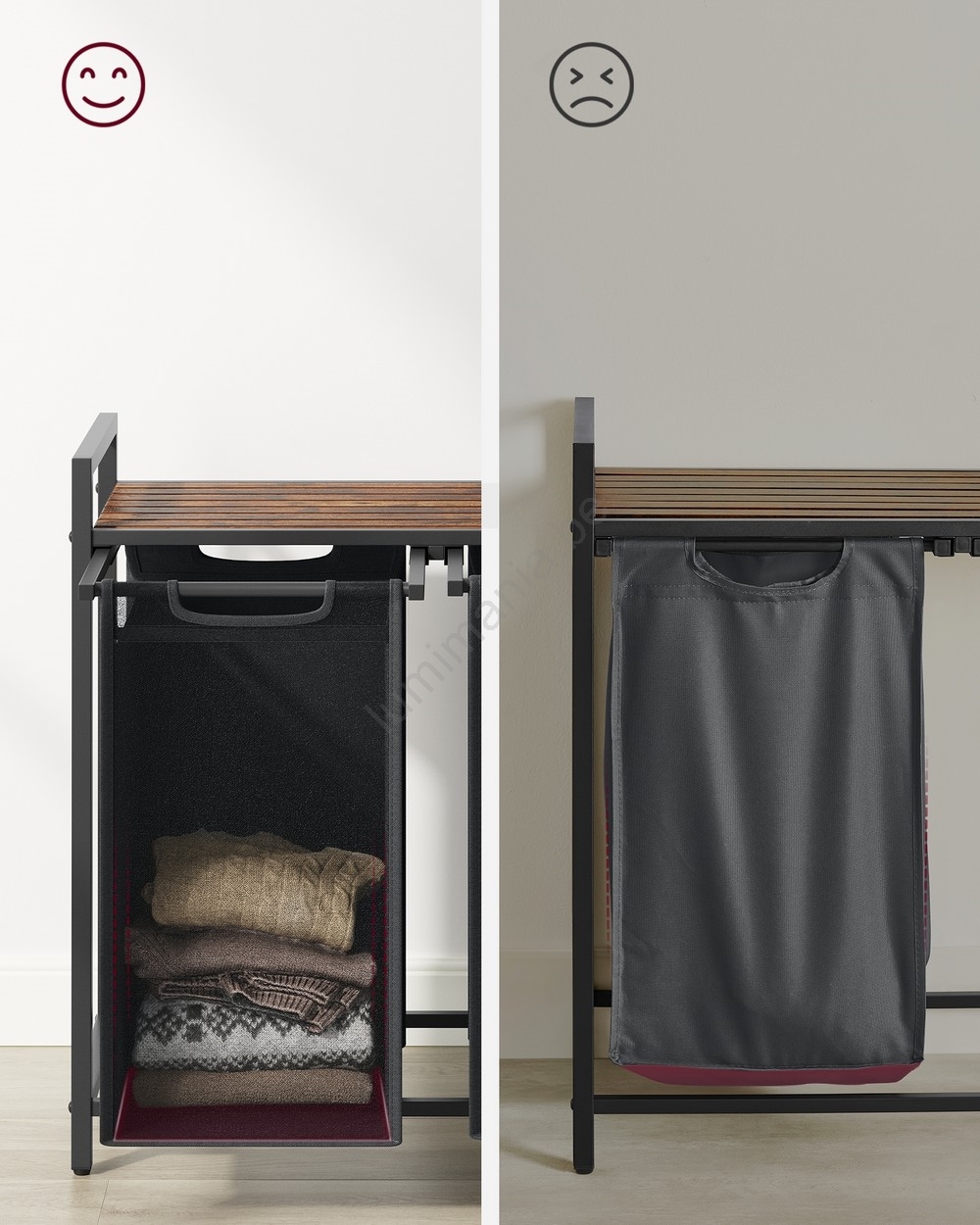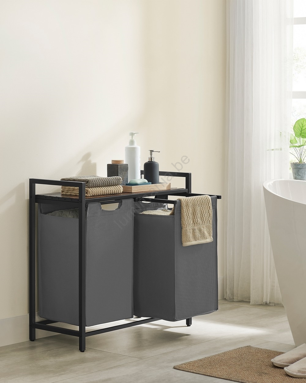 • 2 zakken, 1 plank – Sorteer uw was in twee stoffen zakken (46 l per zak) en plaats wasmiddelen, wasverzachter en andere spullen op de plank.