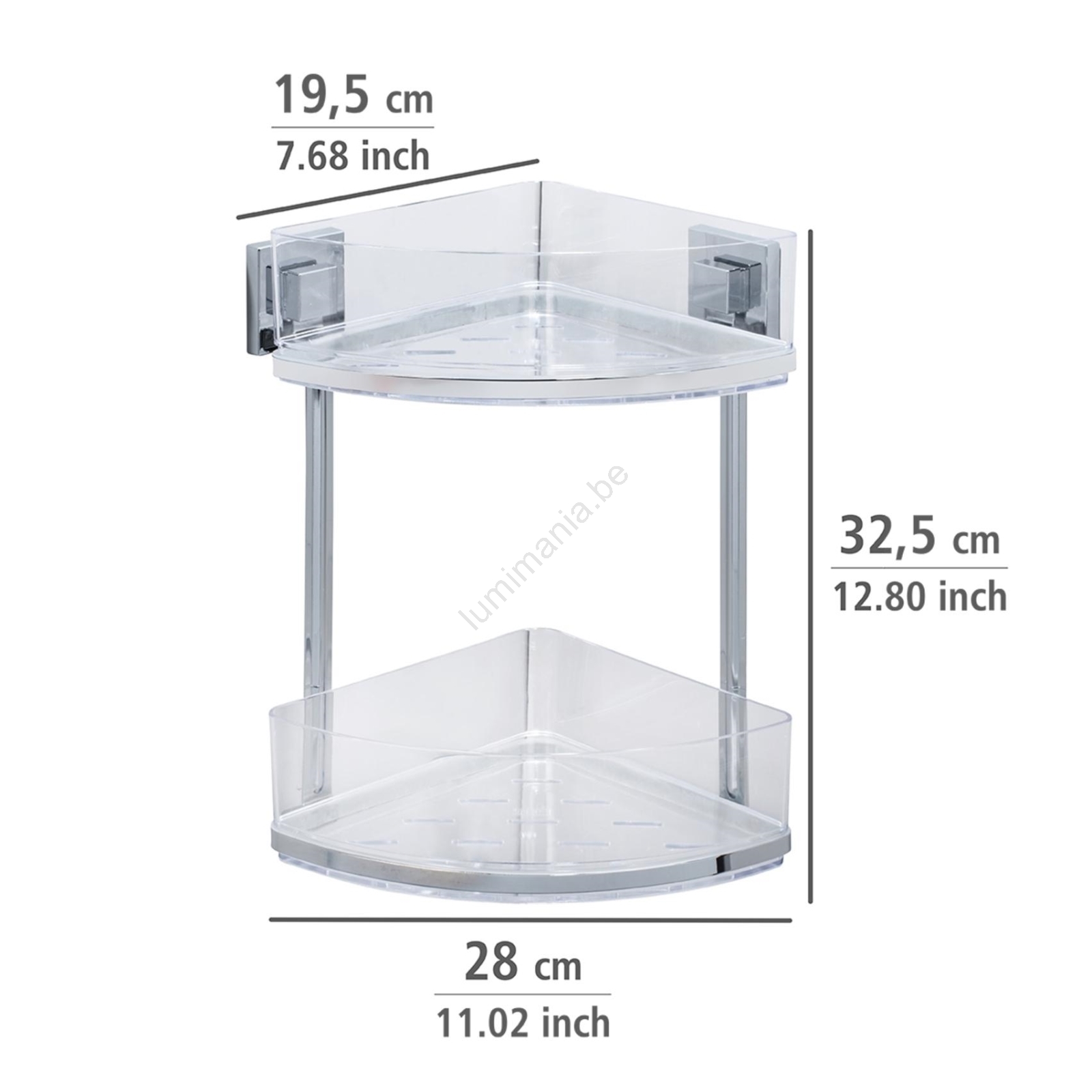 • Hoekplank met twee niveaus – ideaal voor het overzichtelijk opbergen van badkamerartikelen.