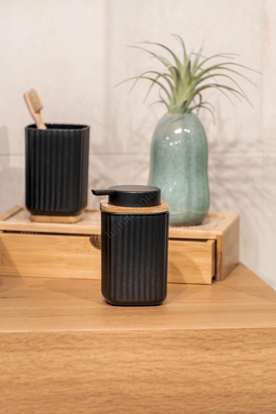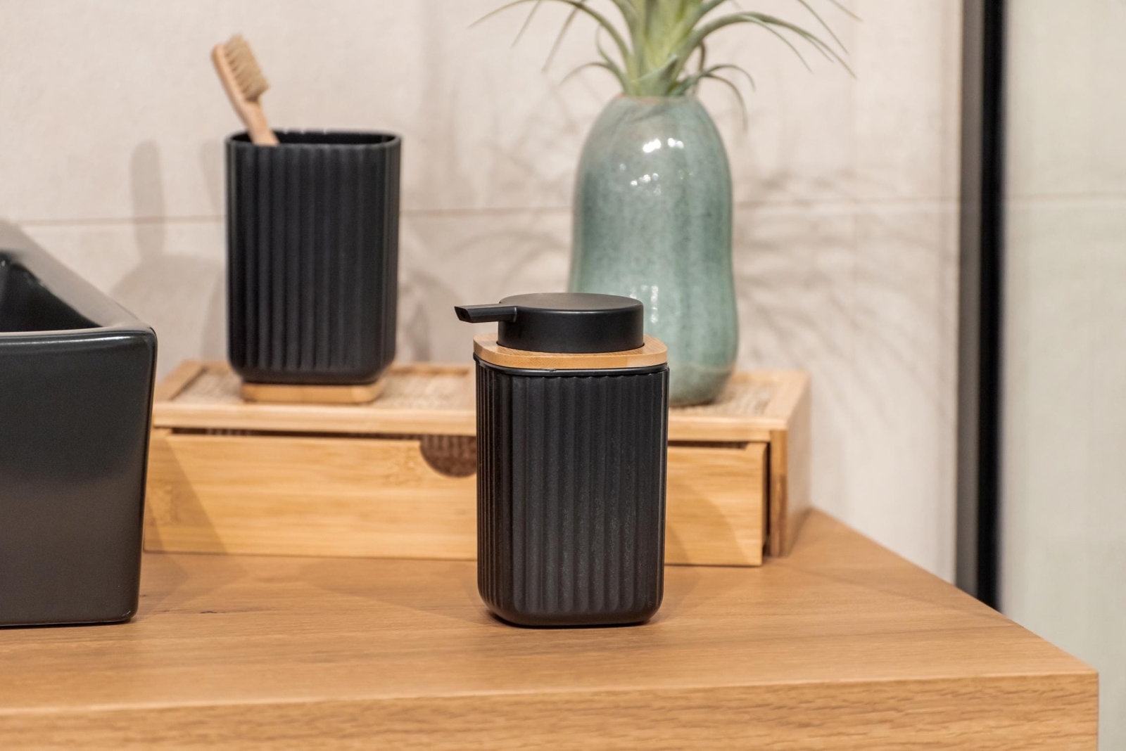 • Elegante zwarte afwerking met een contrasterende bamboe onderkant.