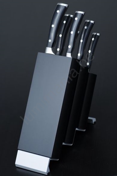 • Set bevat: groentemes 9 cm, vleeswarenmes 14 cm, hammes 16 cm, Santoku mes 17 cm, broodmes 23 cm, koksmes 20 cm, zwarte messenblok.